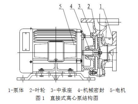 直接式離心泵的電機與泵共軸,葉輪直接安裝于電機加長軸上,中承座連接泵體與電機,內裝機械密封。該類型泵性能可靠,生產成本低,目前國內外使用最為廣泛。直接式離心泵的結構如圖1所示。